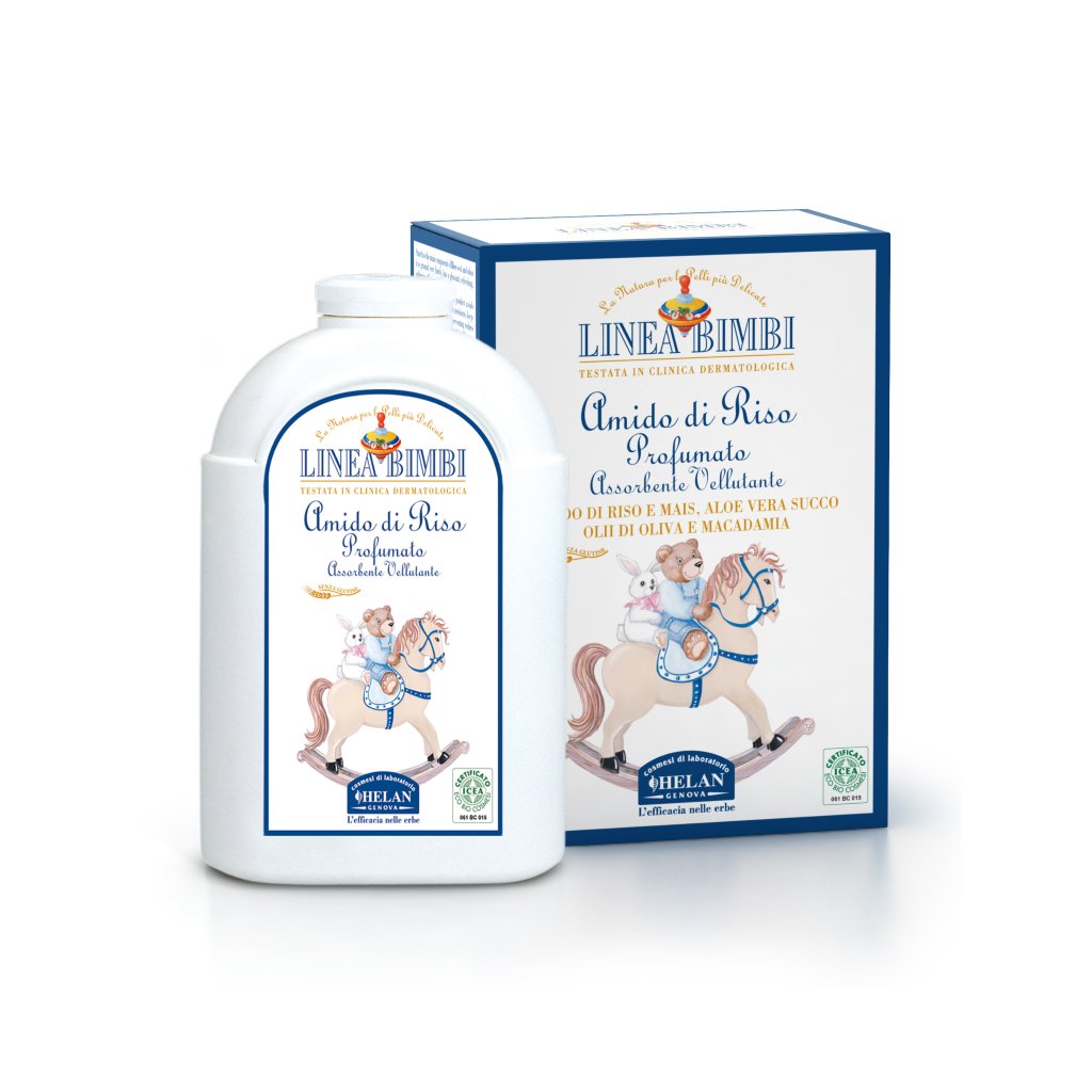 Helan Linea BIMBI Dětský rýžový pudr aplikujte pravidelně při přebalování. Dostatečné množství naneste na zadeček, třísla a záhyby kůže pod plenami.
