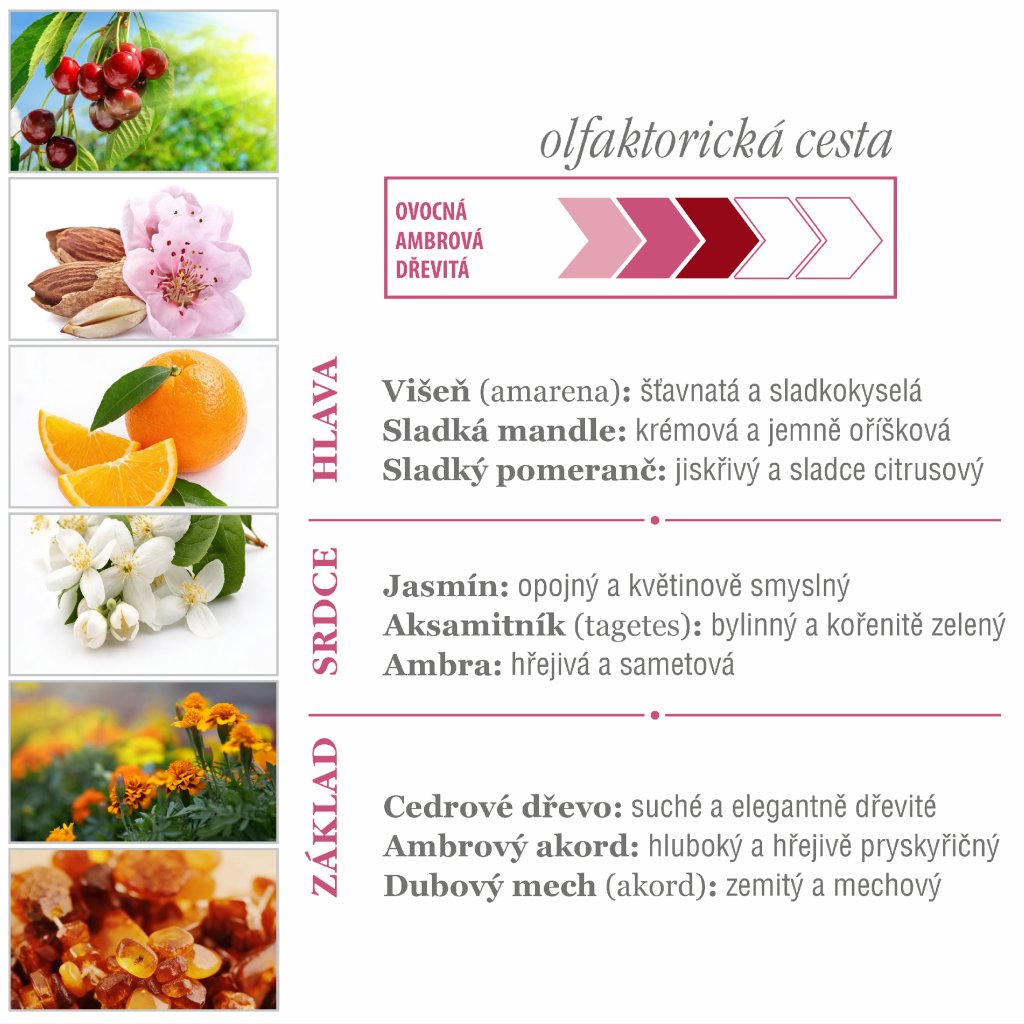 Hlava: Hned první nádech vás překvapí divokým a smyslným olfaktorním zážitkem, kde výbušný kontrast mezi kyselostí a sladkostí černé třešně, typický pro červené ovoce, se mísí se šumivými a živými tóny sladkého pomeranče. Tato jedinečná alchymie je ještě zvýrazněna čistou a vyváženou vůní sladkého mandle.
