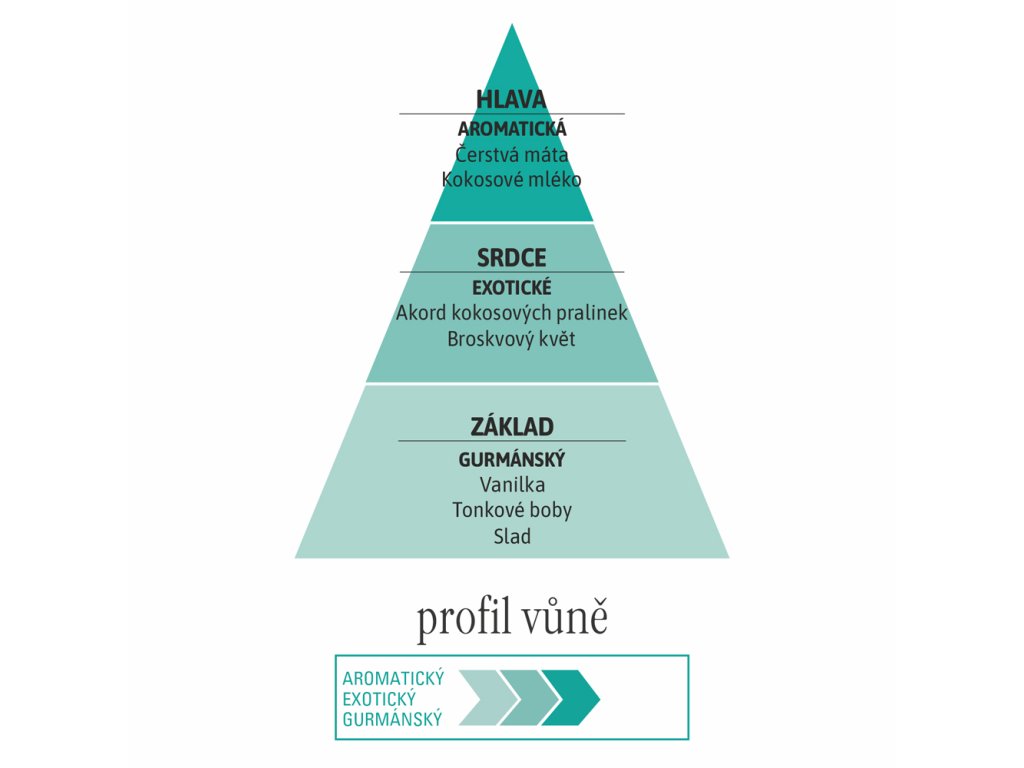 - Nezaměnitelná vůně: Čerstvá máta se mísí s kokosovou vodou, kokosovými pralinkami a s jemností květu broskve. Nakonec je vše završeno vanilkou a fazolí tonka.