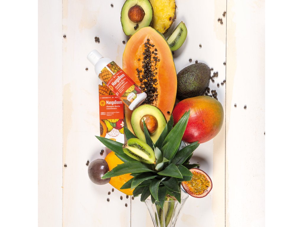 Helan Sorbetti MangoBoom je nejen bezpečný a prospěšný vaší pokožce, ale dokáže také povzdbudit svou jedinečnou exotickou vůní a přenést vás do světa plného radosti a svobody. Je obohacen o výtažky z ananasu a papáje pro energii a radost, zatímco rýžové proteiny podporují regeneraci vlasů. Vitamín C podporuje antioxidační aktivitu, aby vaše pokožka a vlasy zůstaly svěží a revitalizované.