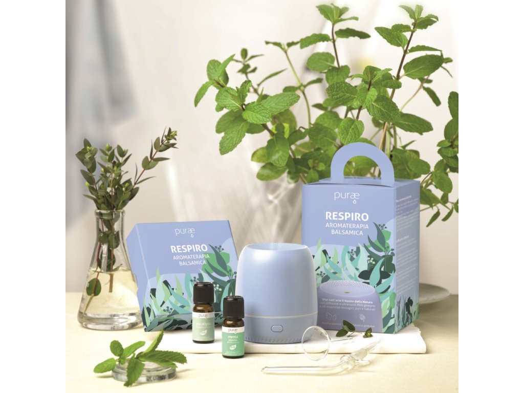 Sada Purae RESPIRO přináší ultrazvukový aroma difuzér s barevným podsvícením doplněný o silice eukalyptu a máty. Difuzér rovnoměrně rozptyluje vůni do prostoru.